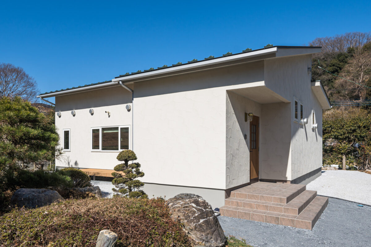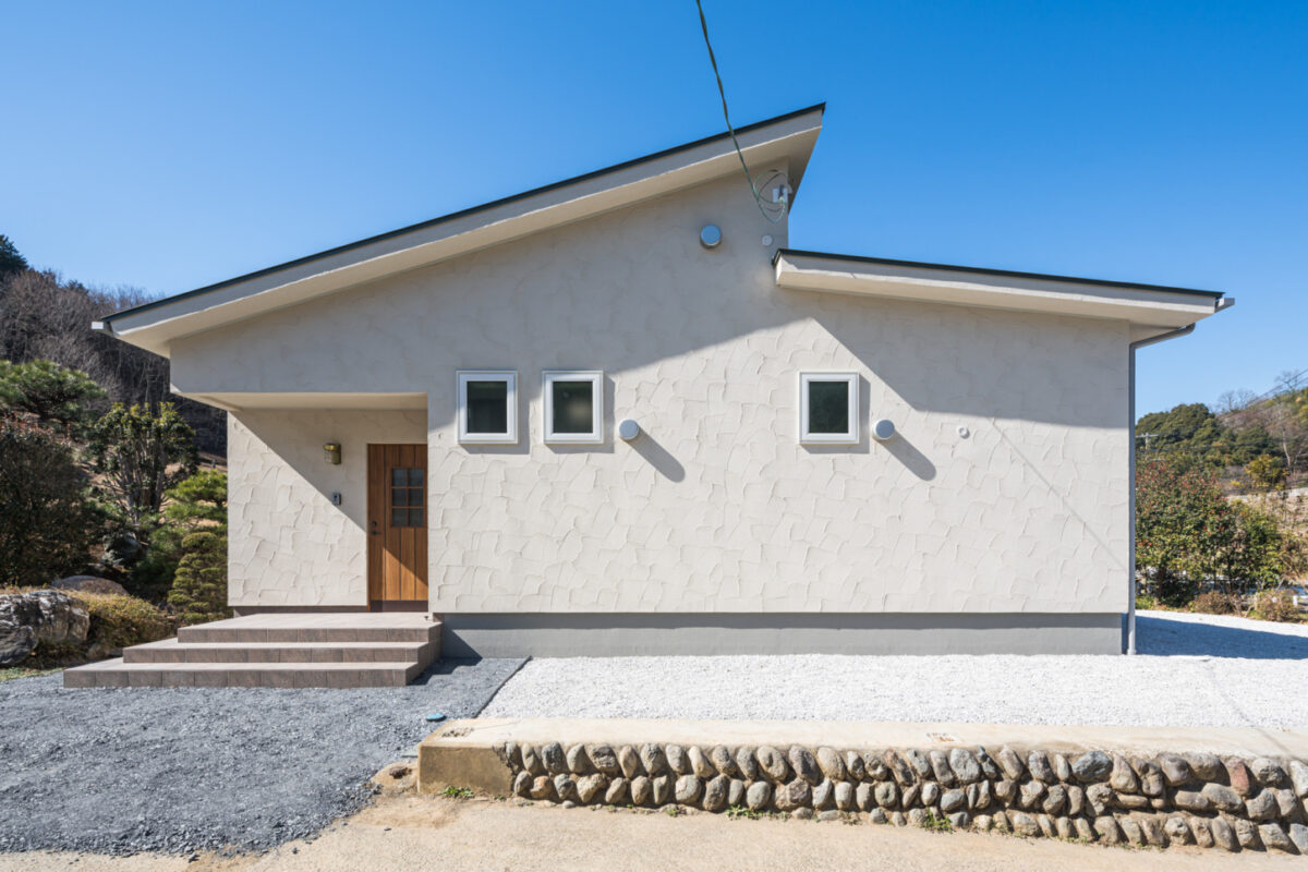 外観は、塗り壁によるシンプルで落ち着いた佇まい。