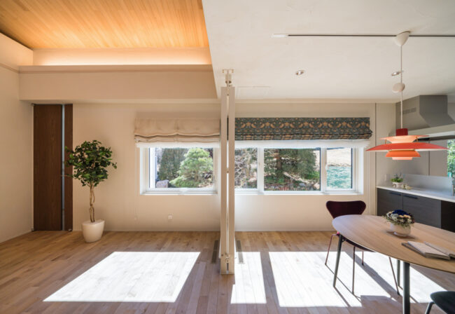さらに、長年大切にされてきた庭木を室内から美しく眺められるよう、窓の配置や視線の抜けにも工夫を施しています。