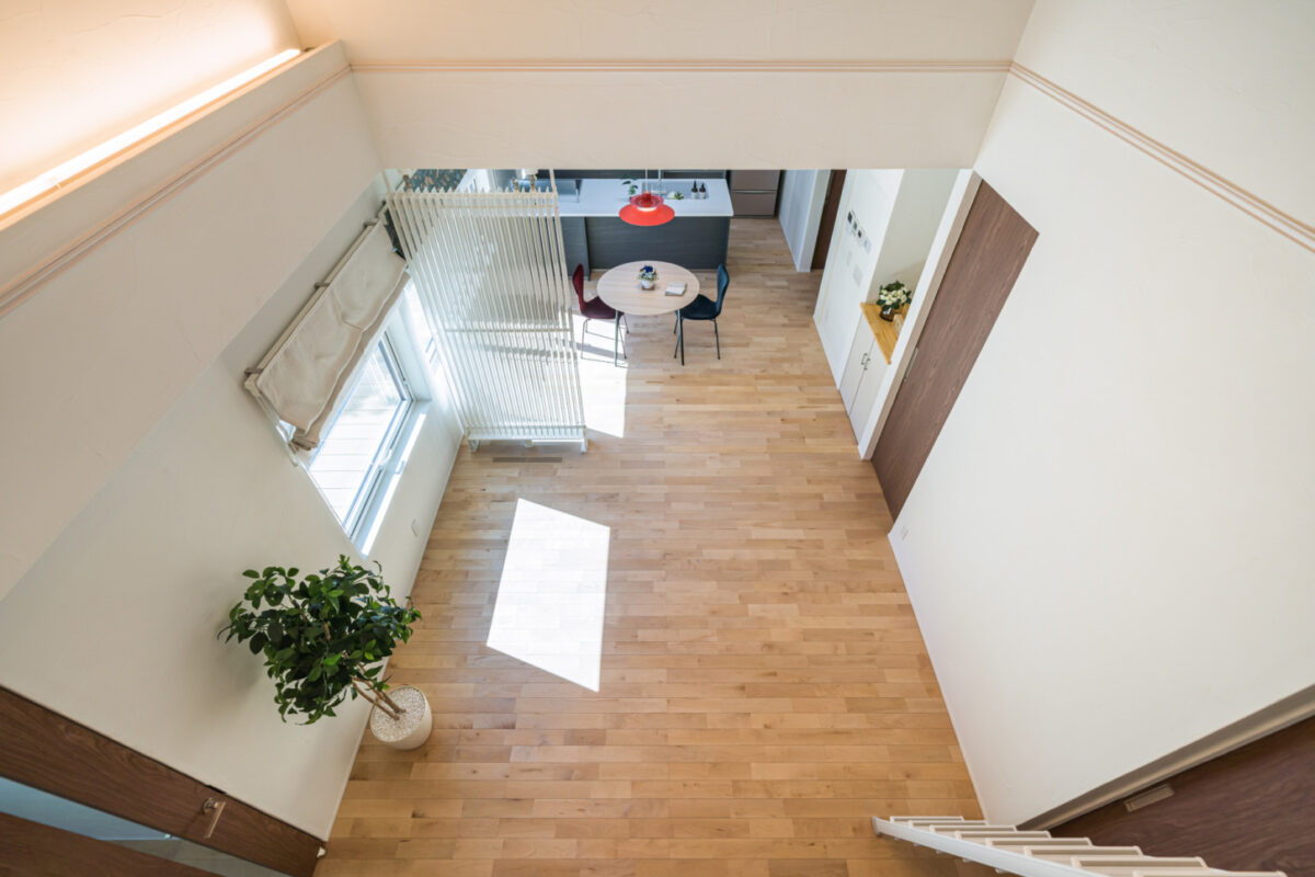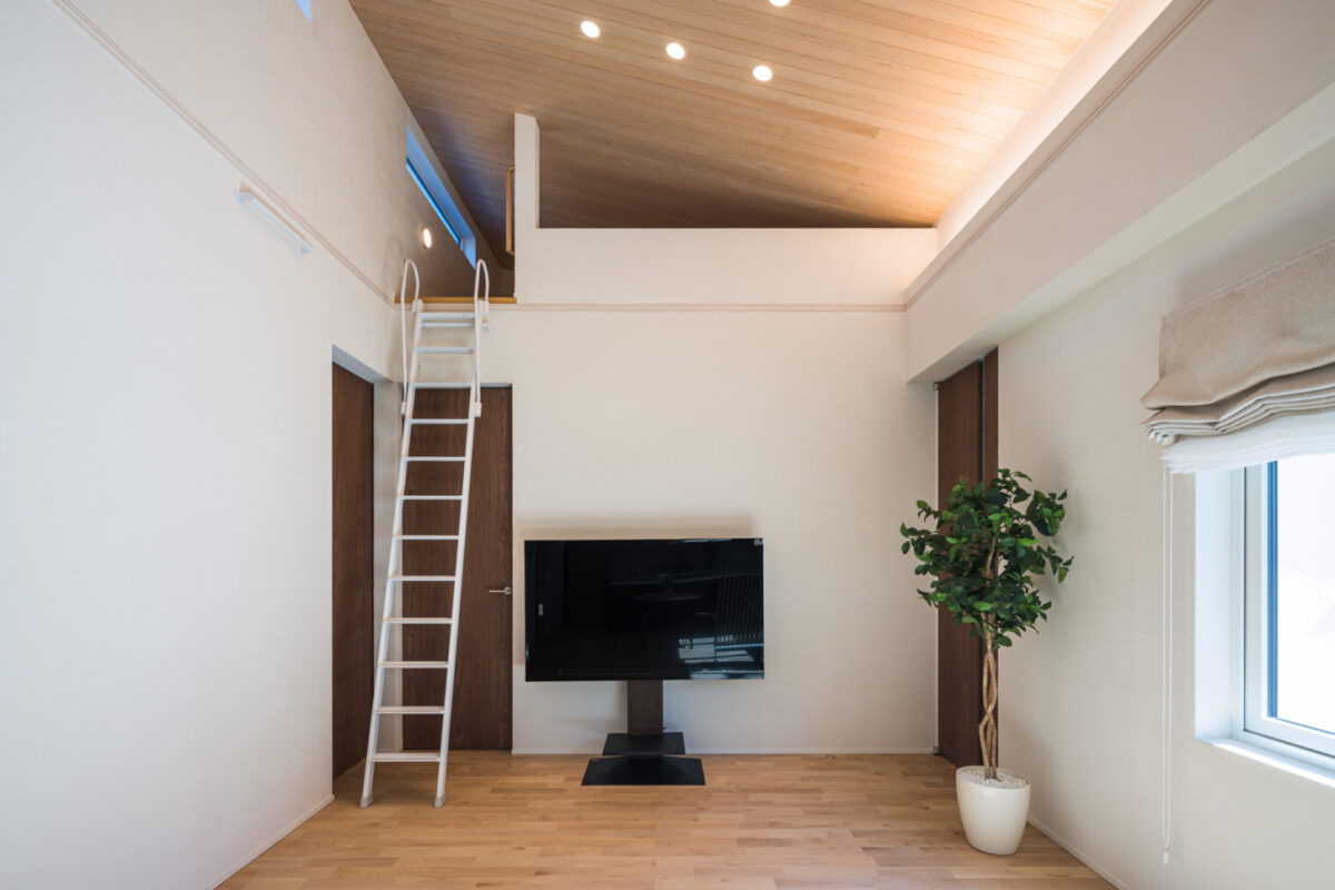 室内は、ロフト付きの平屋。ワンフロアで暮らしが完結しつつ、縦の広がりを感じられる空間構成です。